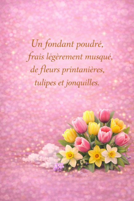 Un fondant poudrée, fraîS légèrement musquée, de fleurs printanières, tulipes et jonquilles.