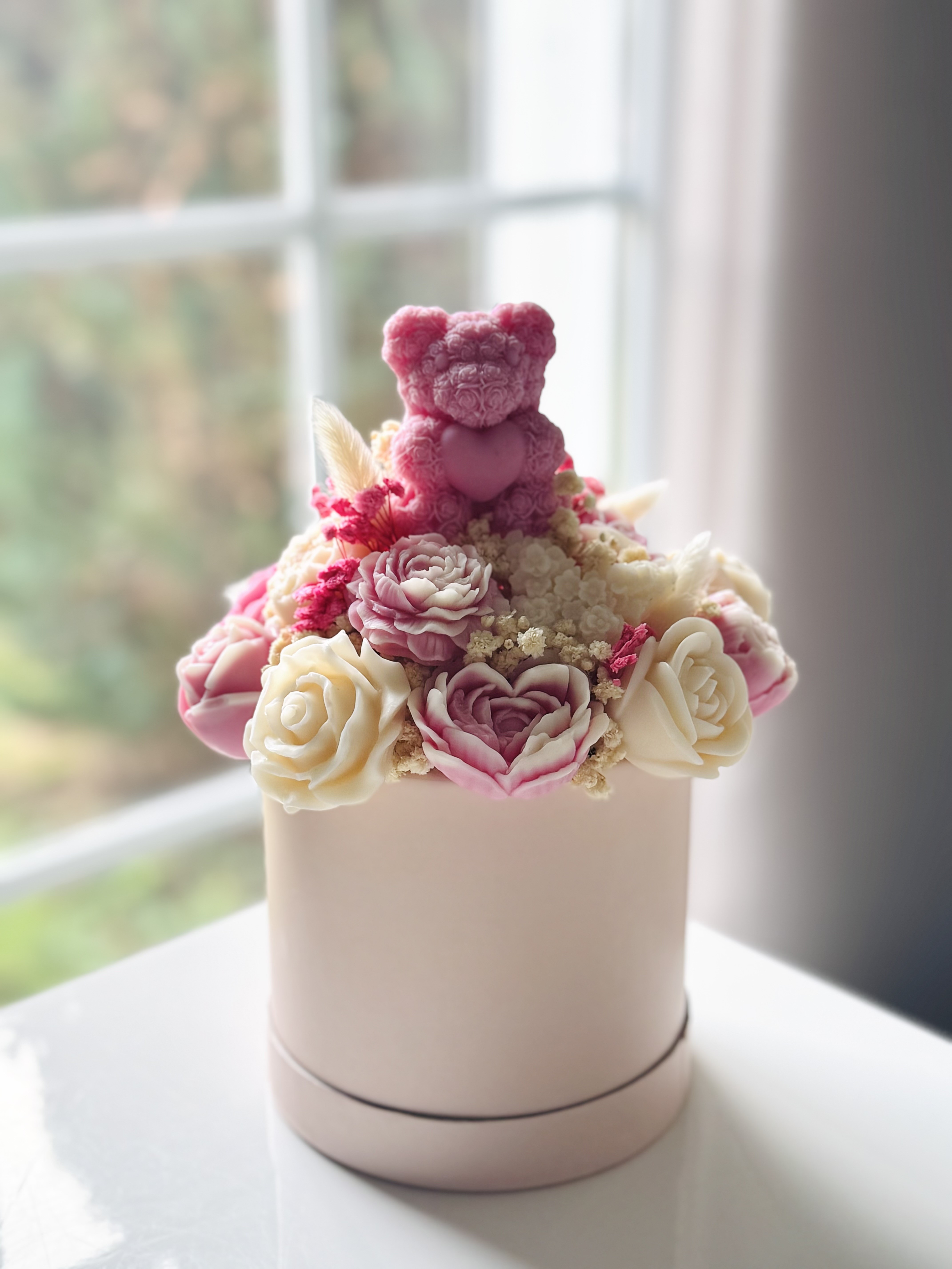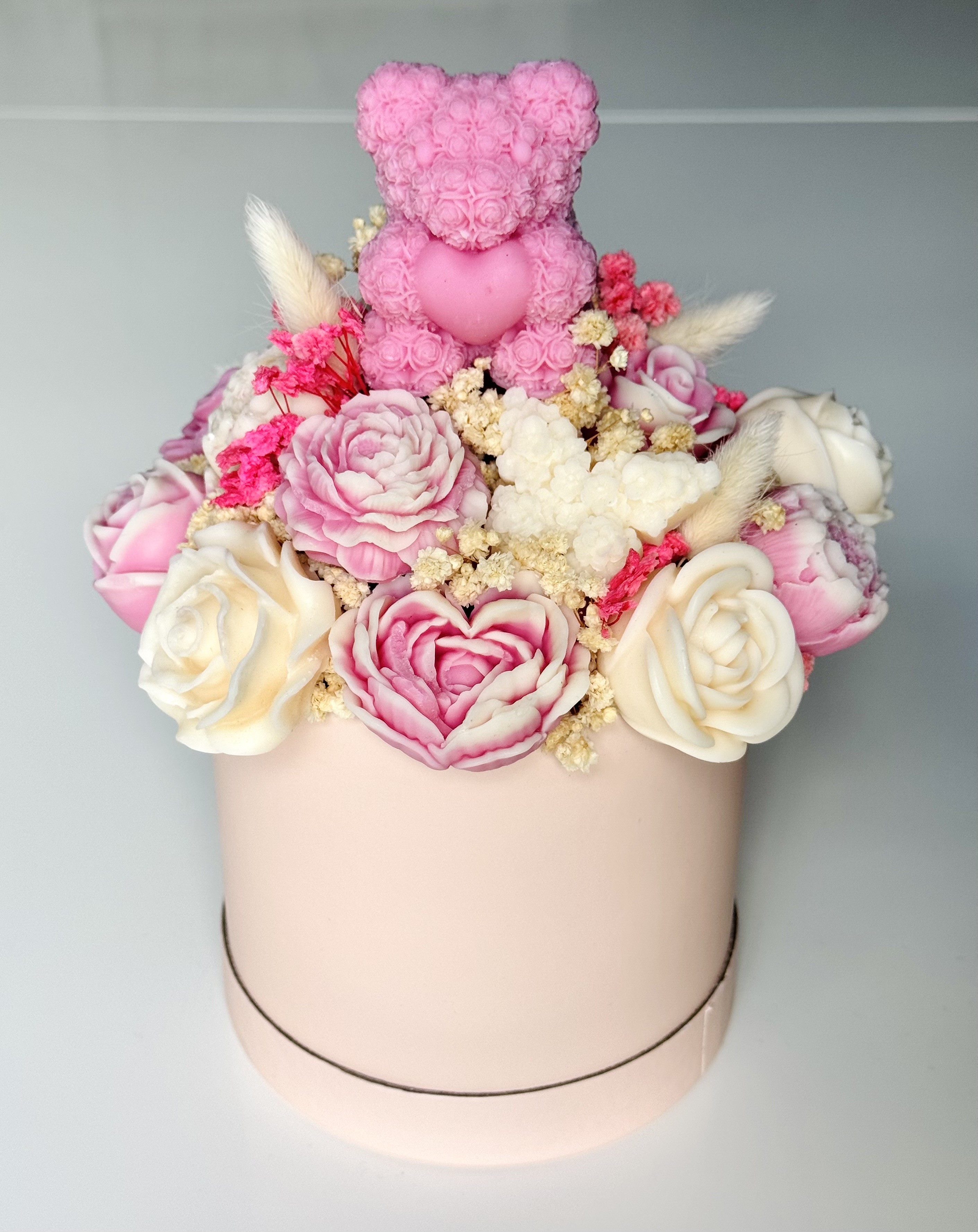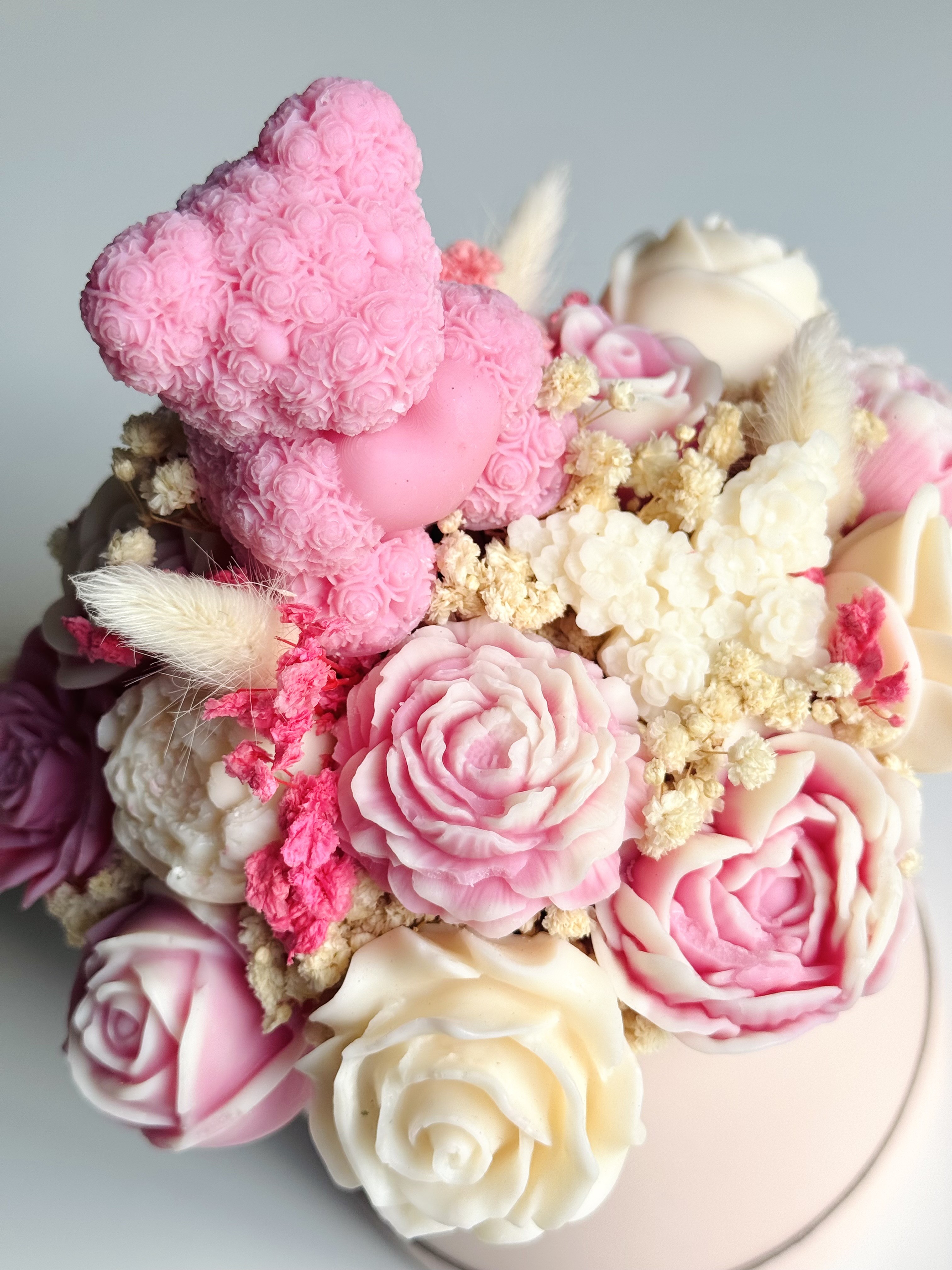 Découvrez notre composition de galets parfumés aux tons rose poudré, fleurs délicates et adorable ourson 💗